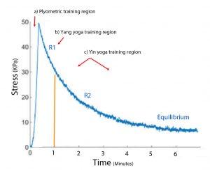Notice in figure 2 that there is an initial, sharp increase in internal stress once a load is applied to the tissues. This is the period of elasticity. Viscoelastic materials stiffen when a fast load is experienced. But, once the load is left to linger, then the internal stress levels start to reduce, more quickly at first (R1), but then it slows down (R2) until equilibrium is reached. The values of R1 and R2 vary by tissue type and location. Carla Stecco has reported that for the lower leg’s fascia (crural fascia), almost 90% of the relaxation occurs within the first minute of stress and almost 100% occurs within four minutes[11]. Overlaid onto figure 2 are three forms of exercise: brief, transient stretches, which occur during plyometric exercises; short term stresses, which are held for up to one minute in most yang forms of yoga (regular Hatha or Vinyasa classes); and longer stresses, which are common in yin yoga classes.
