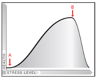 Let’s examine just one illustrative example: a student comes to a yoga class for the first time, approaches the teacher and explains that she has osteoporosis in her lumbar spine. The teacher, well-trained and knowledgeable about osteoporosis, acknowledges the students conditions and offers directions and alternatives for her: she prohibits the student from any flexion at all in the spine, restricts twisting to the upper back only and then, only mildly, and also limits the amount of extension in backbends. The teacher rightfully believes that the student is close to the point labeled (B) in figure 3, but she prescribes for her student stress levels only at point (A), which is none at all. The teacher helps the student to minimize all stress to the lower back and checks constantly on the student to make sure that she is comfortable in every pose. Props are the student’s constant companions every time she comes to that class.