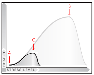 FIGURE 3 – Antifragile: An antifragile object benefits from stress, up to a certain point. As stress increases, so too does the health and strength of an antifragile object. However, once a certain stress level is reached, the object is no longer antifragile, and it will suffer from continually increasing stress. At this point (B) the object is again fragile, but also notice, if stress stays at the level at point (A), the object will also be unhealthy. FIGURE 4 – Fragility and Antifragility of Injured Tissues: When tissues are damaged, the tolerance at which they pass the threshold from antifragile to fragile moves to the left, to point C. Clearly, if stress is applied at the B level, the tissues will be damaged, but if the stress applied remains at point A, the tissues will remain fragile. Ideally the stress should be close to, but not beyond the edge represented by point C.