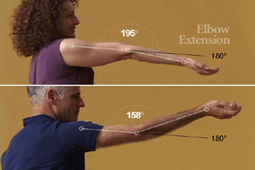 Paul Grilley does a masterful job of explaining the concepts of tension, compression and skeletal variations in his DVD called Anatomy of Yoga, from which the above graphic is taken.[14] This DVD belongs in the library of every yoga teacher and serious student. In it, you will discover that there is a vast difference in our bodies; and that what works and is easy for one person may be death and destruction for someone else. We are all unique. You will see how your uniqueness manifests in your yoga postures. Curiously, medical textbooks that describe the variations in ranges of motions of our joints almost always claim the elbow joint can move between 30° to 40° (almost full flexion) to a maximum of 180° (full extension.)[15] And, yet, in most yoga classes, teachers will often see students who easily go beyond the 180° position assumed to be the limit by medical texts. Going beyond 180° is assumed to be a pathology, a problem. But, since there is no pain associated with this degree of extension and students can easily go there, clearly this is not some pathology needing correction.