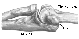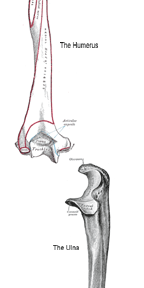 This is controversial – hang out in hyperextension!? Is that safe? To answer that, we need to delve into the anatomy of the elbow. Here we see the lower portion of the upper arm bone, the humerus.[7] Below it we see the upper end of the main lower arm bone, the ulna.[8] Notice how they are supposed to fit together.