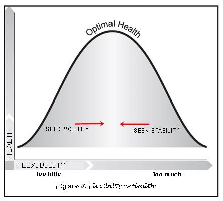 Yoga is not contraindicated and indeed can be a healthy adjunct to the exercises hypermobile people perform, with the caveat that sustained end of range movements are not recommended. Strength building is generally a good thing; it helps to promote stability. We can turn this understanding into a graph: figure 3 shows an N-shaped curve with health along the vertical axis and flexibility along the horizontal axis. If we have little flexibility, we are not very healthy. However, if we have too much flexibility, we are again at risk of poor health. However, we need flexibility! Where the middle of this curve is for you may be quite different from someone else, but our intention should be to come to the middle. If we are on the left side of the middle, we need to work on increasing mobility (stretching). If we are on the right side, we need to work on stability (strength). In both cases we want to seek our optimal range of motion to maximize health.