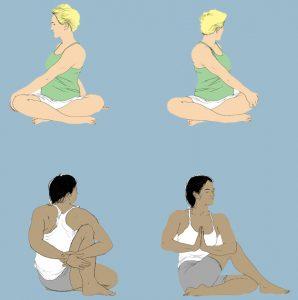 The ability to twist and bind on one side but not the other may be due to a combination of factors. Notice in the bottom figure that when twisting to the right side, the thigh is not very adducted. It is almost in line with the right hip. But when twisting to the left side, the thigh is adducted quite a bit, which makes it possible to wrap the arm around the leg and clasp hands. On this second side, the ability to twist and bind may be due more to the range of motion at the hip sockets and the shoulders than to the twisting ability of the spine. Or it may be due to a little of all these factors…                                                                                                                                                                                            Read the rest of this article