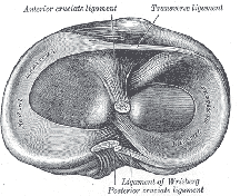 You can see in this picture that there are two side ligaments: the lateral collateral ligament (which runs along the outside of the knee) and the medial collateral ligament (which runs along the inside of the knee.) These two tough bands of collagen prevent the knee from sliding from side to side. At the top of the tibia (the largest of the two lower leg bones) is a plateau, and at the bottom of the femur (the large upper leg bone) is another plateau. The two, approximately flat plates, do not fit together perfectly; in between them are two C-shaped pieces of cartilage called the menisci: the lateral (outer) and medial (inner) meniscus help the femur to slide on the tibia when the knee bends. They act as shock absorbers as well as ensuring a snug fit for the plateaus when the knee is straight.