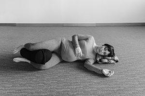 “Women are often advised not to lie on their backs because the weight of the baby compresses the vena cava, a vein that brings blood back to the heart. However, this caveat is often overdone. If all the blood returning back to the heart was being stopped, you would notice that! No woman would stay in a place where this was happening, so don’t become overly protective. Pregnant women are not fragile glass figurines: they are a lot stronger than most people (I am thinking mainly of male teachers) give them credit for. If you find lying on your back nice, go for it. If it doesn’t work for you, don’t do it.”