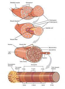 As shown in figure 2, the architecture of a muscle can be described as a series of tubes within tubes within tubes. At the gross level, we have the whole muscle—let’s call it the semimembranosus (one of the hamstrings). The whole muscle is wrapped in a fascial tube called the epimysium. Within the muscle is an array of smaller tubes called muscle fascicles, which have their own fascial wrappers, called the perimysium. Within those tubes are smaller tubes called muscle fibers, wrapped by the endomysium. These muscles fibers are the muscle cells, but so strange are these cells that they are rarely referred to as such (some muscle cells can have hundreds of nuclei and thousands of mitochondria.[4]) Instead they are called fibers. But, the tubes within tubes don’t stop there: within the fibers are even smaller tubes called myofibers. These are made up a plethora of contractile units called sacromeres. More about the sarcomeres later.