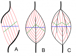 Figure 2 doesn’t really show how the muscle fibers are orientated within the muscle. Rarely do the fibers run longitudinally within the muscles. More often, as shown in figure 3, they run at an angle to the long axis of the muscle. This is called pennation, which is Latin for winged or feathered. The red lines show the orientation of the muscle fibers within a full muscle. Notice that they do not run along the long axis of the muscle. The horizontal blue lines indicate the muscle’s diameter, but the green lines indicate the cross section of the muscles at right angles to the muscles fibers length. Since muscle strength is proportional to the cross section of the muscle fibers and not the diameter of the overall muscle, the orientation of the fibers is very important. The bigger the cross section of the muscle (the green line), the stronger the muscle.